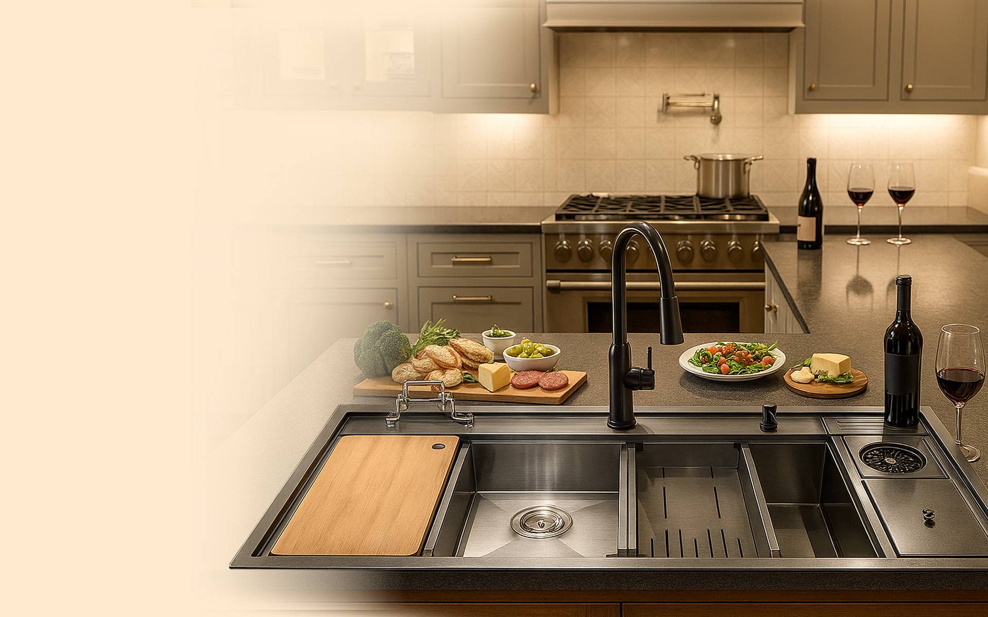 Command every square inch of your counter with Santovena’s full-scale workstation sink.