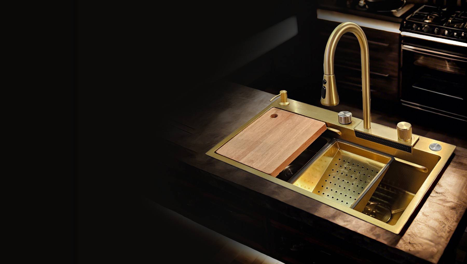 Transform prep into show-time. Our gold multipurpose kitchen sink pairs function—cut, rinse, drain, all in one shimmering sink.