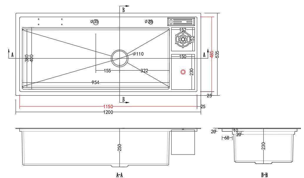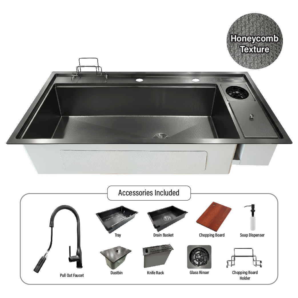 Description: Titan (XL) Honeycomb Kitchen Sink Dimension: 120 x 53.5 x 24cm Material: 304 Stainless Steel Color: Gunmetal